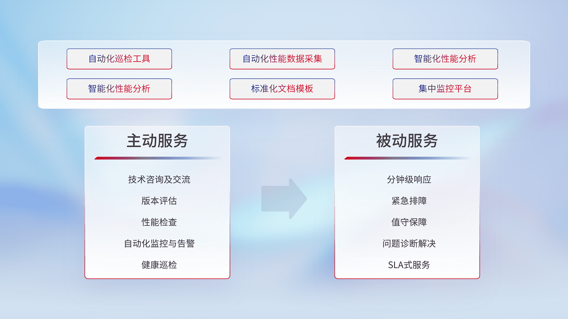 智能化工具和标准化文档,,保障服务质量,,提供主动服务(包含技术咨询、、版本评估、、、性能检查、、、、自动化监控与告警、、健康巡检)和被动服务包含(分钟级响应、、、紧急排障、、、、值守保障、、、问题诊断解决、、、、SLA服务)。。